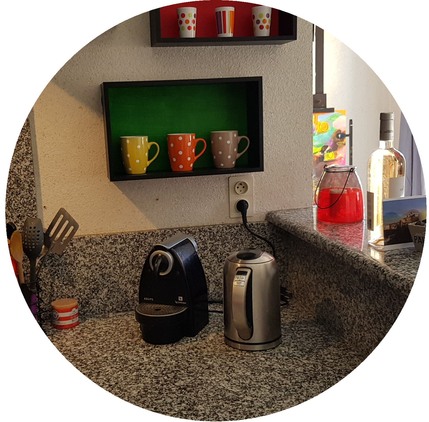 Evier : 1 bac avec partie égouttoir. Deux torchons sont à votre disposition : vaisselle et main. Liquide vaisselle, brosse, éponge et savon main sont disponibles.