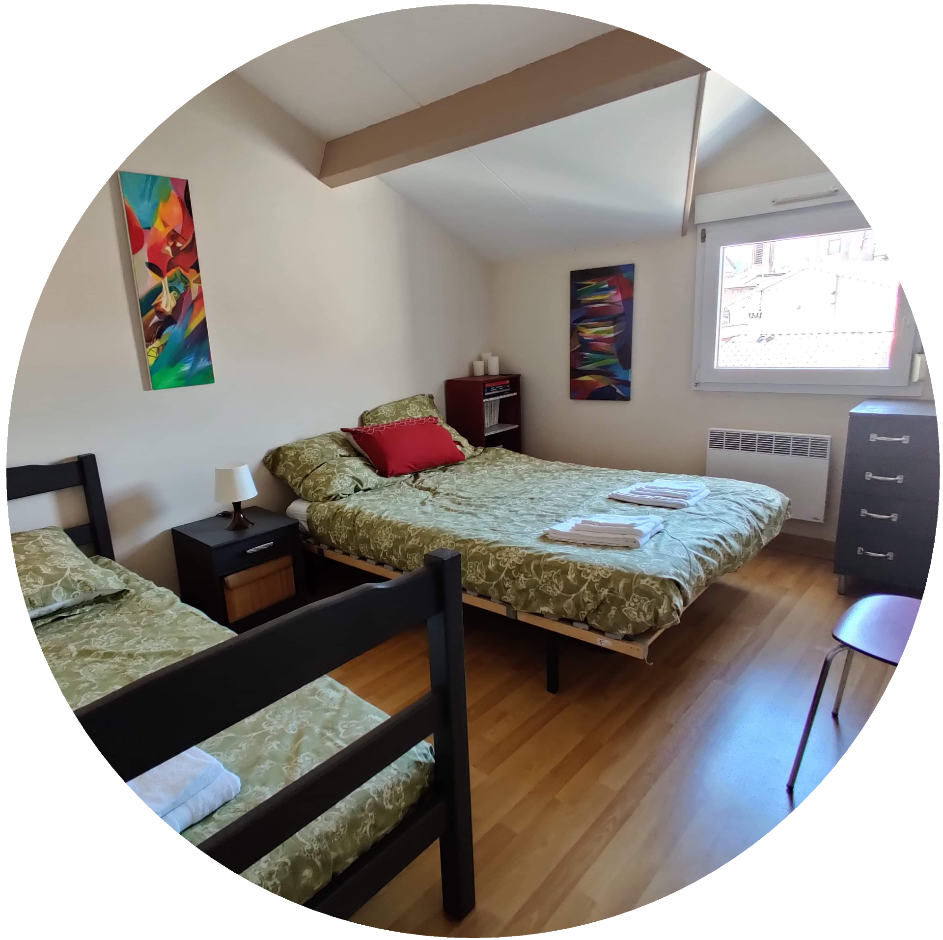 Chambre 2 : elle est équipée d'un lit 1 place et d'un lit 2 places, d'un chevet, d'une petite bibliothèque et d'une commode.